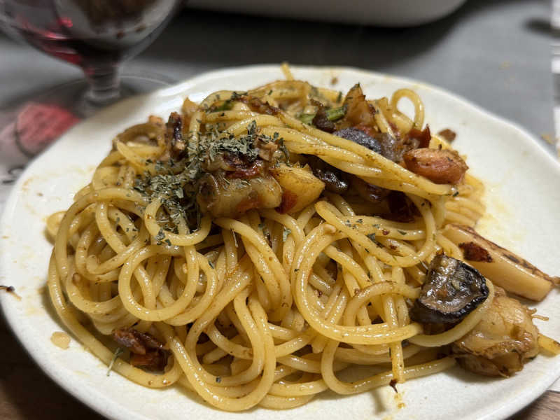 家でアヒージョ。残ったアヒージョをホットプレートで焼きパスタに。