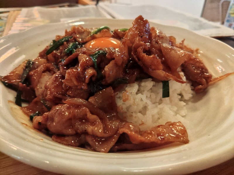 アクリとニンニクダレが効いた焼肉丼のセット。こう…生卵がでんと落としてあるの大阪だなぁって感じ。好き