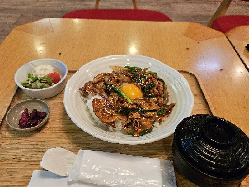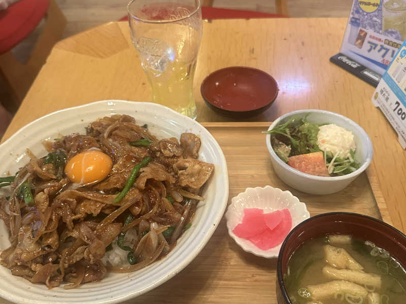 スタミナ丼は豚はしっかり濃い味で、卵黄と混ざってまろやか。ご飯が大盛り無料でアクリとサラダと味噌汁付