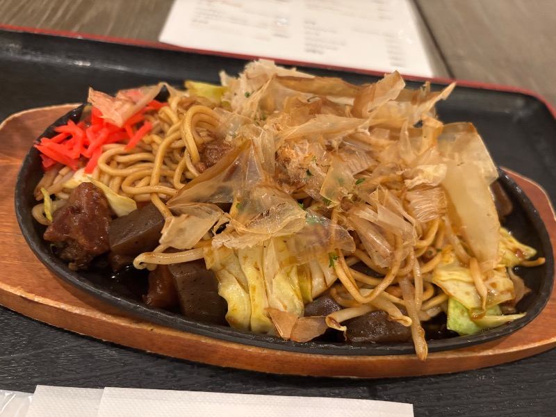 甘辛く煮た牛ホルモン?とこんにゃくが入った、甘辛いタレの焼きそば。つまみにいいね。