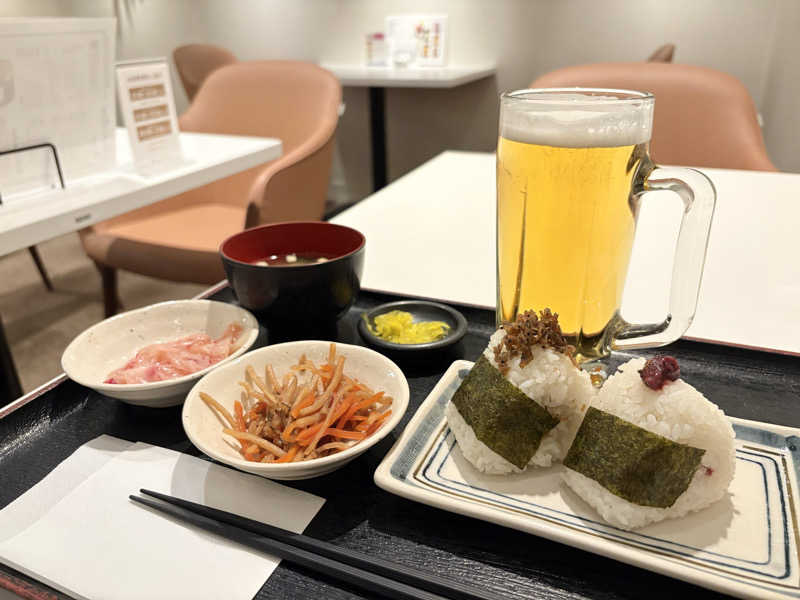 夜食で背徳感🍙🍺☺️おにぎりは具が2種類選べる🍙ちりめん山椒と梅🍙生中でいい気分😌