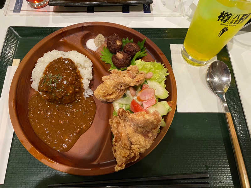 カレーと唐揚げと肉団子がセット。プラスドリンクが付いてくる。カレーが美味しい。