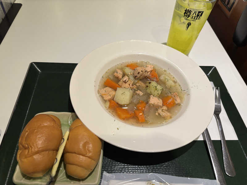 サーモンスープ初めて食べたけど、優しい味でサウナ後最高でした。パンとの相性も抜群。