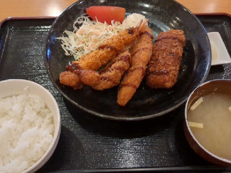 男は好きなどんぶりです! 底がカレールゥにご飯埋まってます キャベツとエビフライ2本と鶏唐揚2個