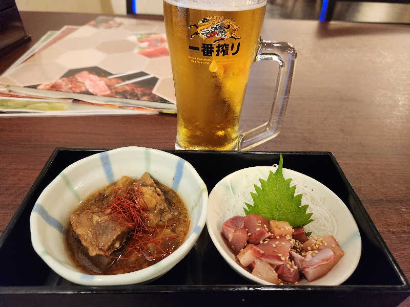 蒸し豚キムチ、牛すじ煮込み、生搾りサワー🍋