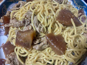家サ飯。味しみ大根&豚肉+大好きな菊水の麺。煮物の残りをアレンジ(茹でた麺にかけただけ)旨し!