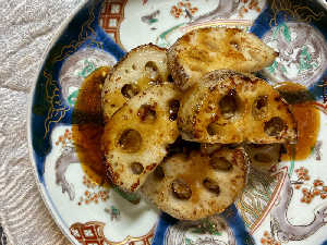 蓮根に挽肉だねを乗せて焼いただけ。ソース→醤油、オイスター、カレー粉。白米がとっまらないっ!