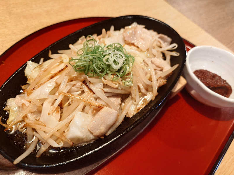 辛味が別皿、自分で調整出来るてのが良い。 傾けてある鉄板もナイス。これはご飯大盛で食すべき。