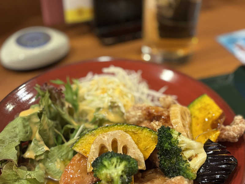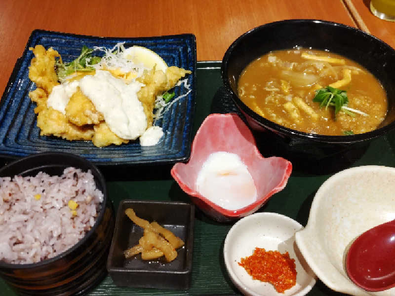 ミニカレーうどんを味噌汁、自家製豆腐、ミニゼザートに変更 ご飯を十六穀米に変更 唐揚げ美味しい