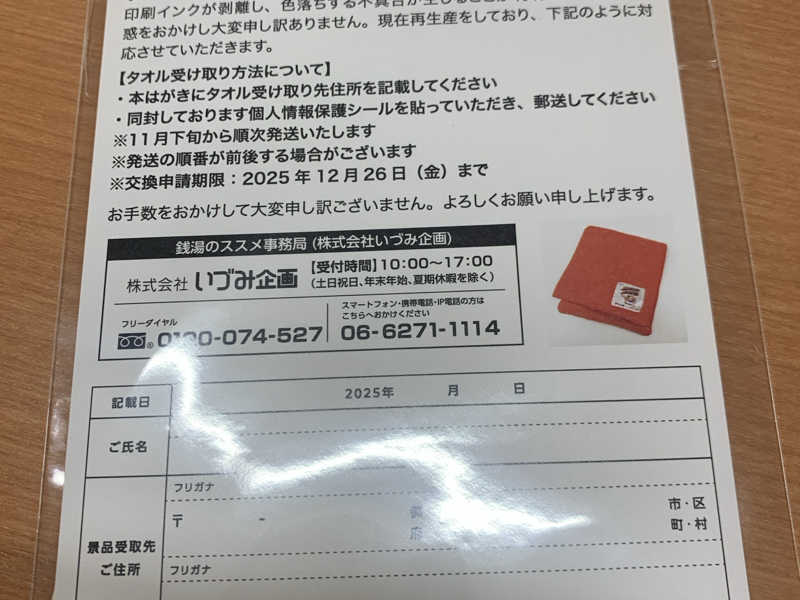 「おめでとうございます!ただ、景品のタオルに欠陥が見つかりまして…」ということで後日配送してもらえるハガキをもらいました。