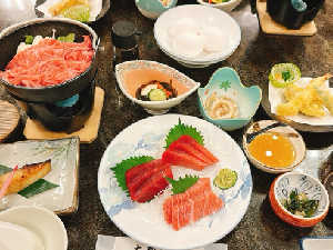 宿泊プランの豪華なサ飯。 口の中でとろける大間鮪も、大間牛すき焼きも美味...!