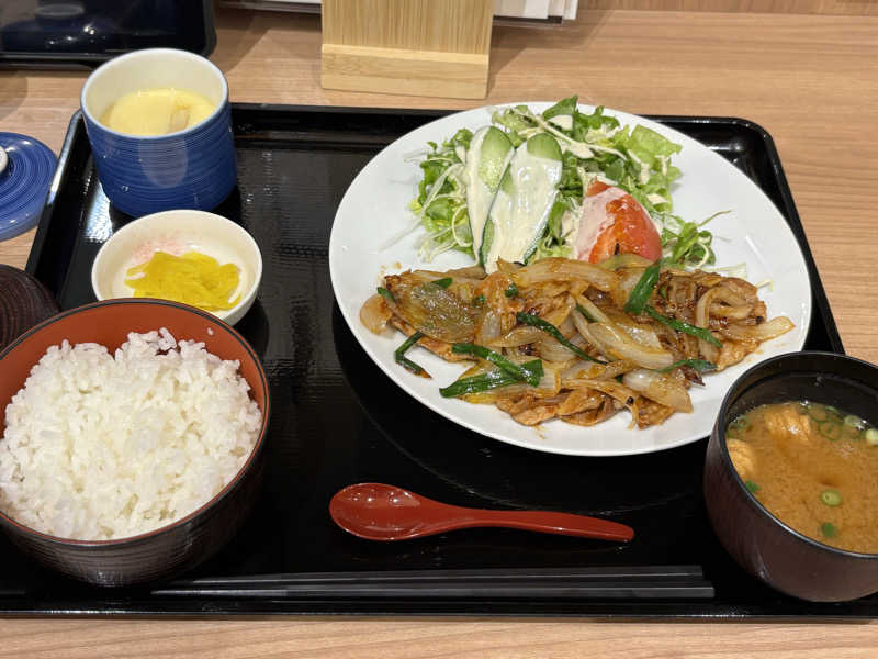 迷ったときはしょうが焼き定食😉自家製ふりかけがついてきた😇おつまみ付生ビールセット追加🍺