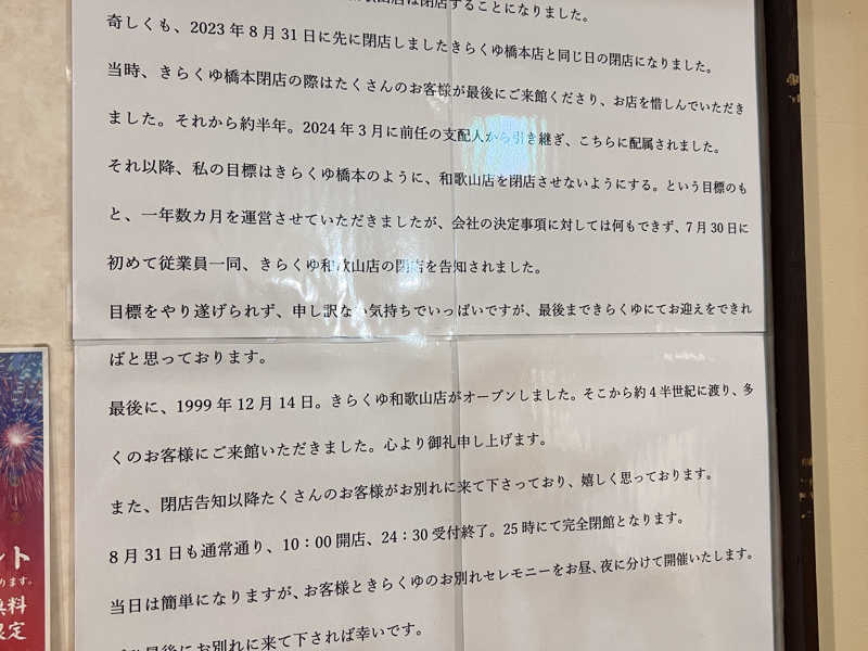 とうとう、この日がやってまいりました😔きらくゆ和歌山店さん♨️閉館の日!