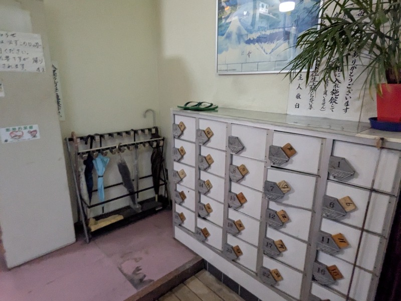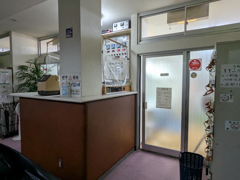 入口が左右分かれてて両方暖簾が同じという悩ましさ。中の靴箱の数字の色が赤と黒で違うのを頼りに右側に。後で気づいたけど、入口の上の漫画調の絵が男女違った。あと間違って入っても一応フロント型だから大丈夫そう。淡々とした強そうなおばちゃん。サウナは銭湯入浴料に込み。