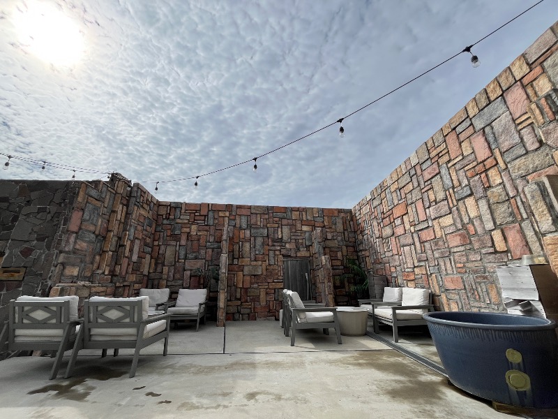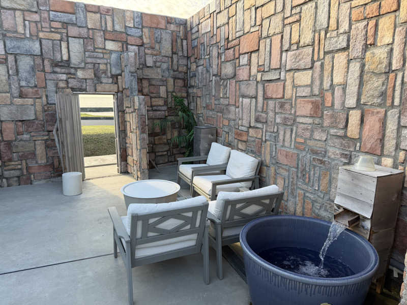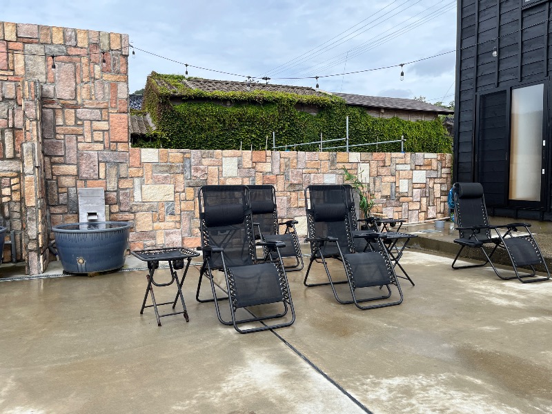 休憩は内気浴にアディロンダックチェアが3つ、ベンチが1つ、整い椅子が2つ。