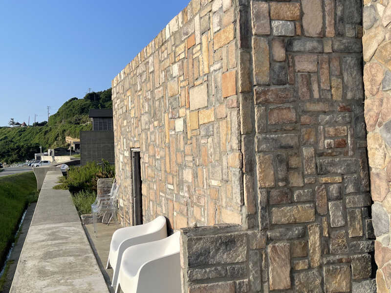 サウナ室は中規模程度の広さ。壁に様々な石が用いられていて、黒と白のコントラストがどことなく波を彷彿とさせ、すごく似合っている。写真は照度を上げてるから明るいけど、実際は薄暗く、完全に俺の好み。薪の燃焼音と外の水の流れる音しか聞こえてこない。ひと目でパワフルさが伝わる巨大な薪ストーブは、あまり見なれないサウナストーンを採用している。もちろんロウリュはほうじ茶。ジューっと茶葉を煎る様な感覚で、サ室の外で香ったのとは少し違う、パンチのある香り。五感に語りかけてくる。サ室に入った時は、マイルドに包み込む系の、副交感神経優位リラックス型サウナかと思ったが、ロウリュをするとバチッと熱が伝わってくる。でも、1分程で抜けていき、換気がかなり効いている。だから苦しくない。これも完全に俺の好み。ええなーと呟いた。サウナベンチは何かの箱なのか、この辺の仕事で使ってたやつをリユースした感じがあった。