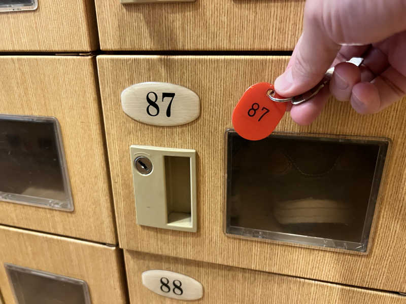 日曜午前サウナ 9:30 IN。大人一般 800円。初訪問。下駄箱は 87 (はな)。合計 1セット、1.6kg減。