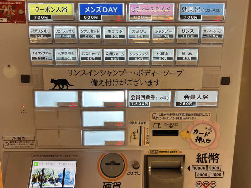 受付。券売機があるが、受付で確認すると、現金か PayPay が利用可能とのこと。PayPay でキャッシュレス決済。下駄箱の鍵は個人管理。