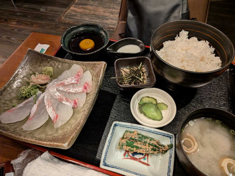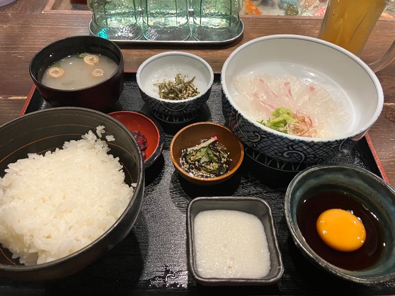 鯛のお刺身を卵と合わせたタレにつけて食べる✨最後はご飯にぶっかけてかきこむ。これもまた美味し👍