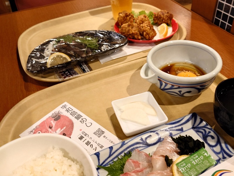 写真の籠盛りの他に鯛釜飯と味噌汁。 追加した鯛のお造りと日本酒(石鎚)も美味かった。