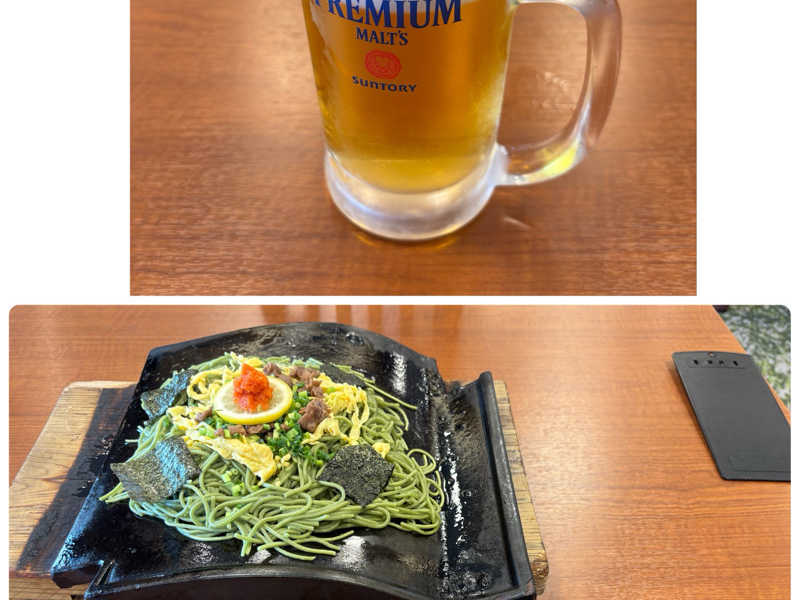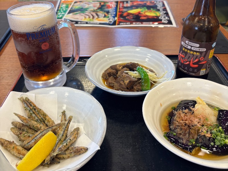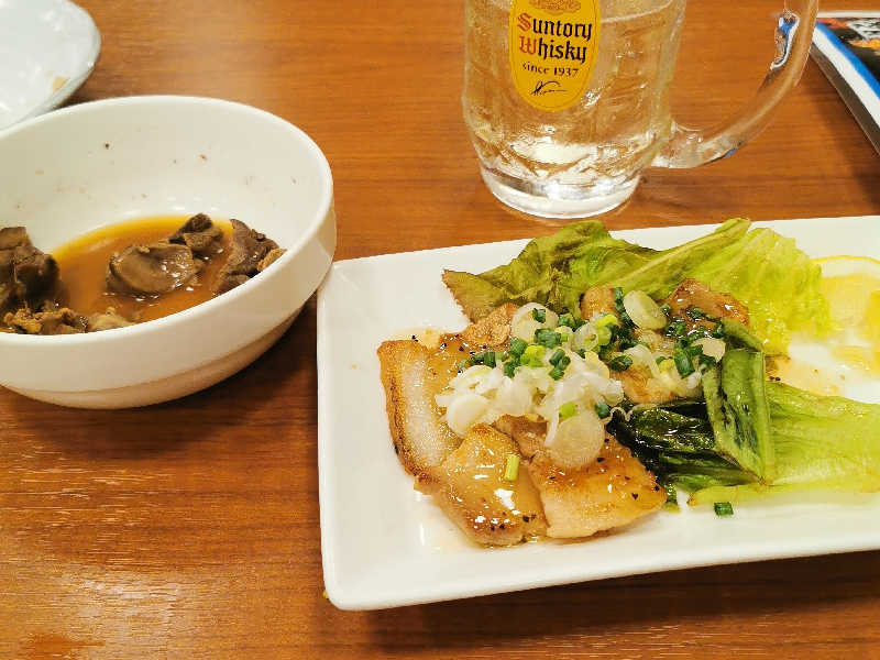 鶏レバー、ナスのおひたし、塩ネギ豚バラの3品。どれも美味し。アカスリのおまけでハイボール!