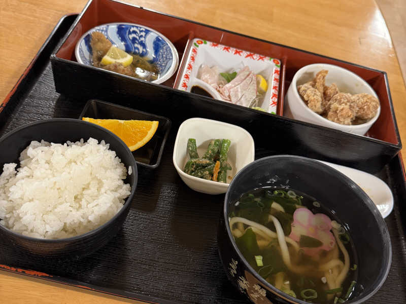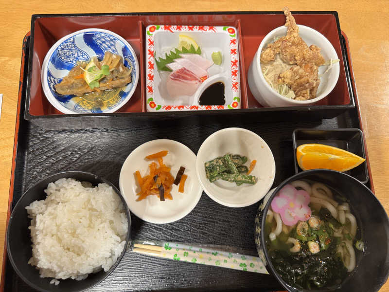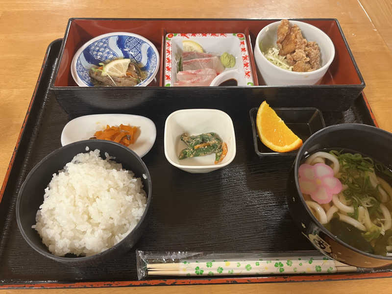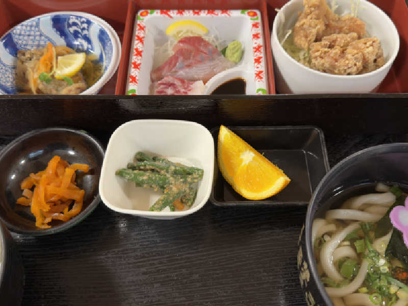 刺身とうどん、春巻き、唐揚げ、卵焼き、小鉢と名前のとおりまんぷくまんぷく😋
