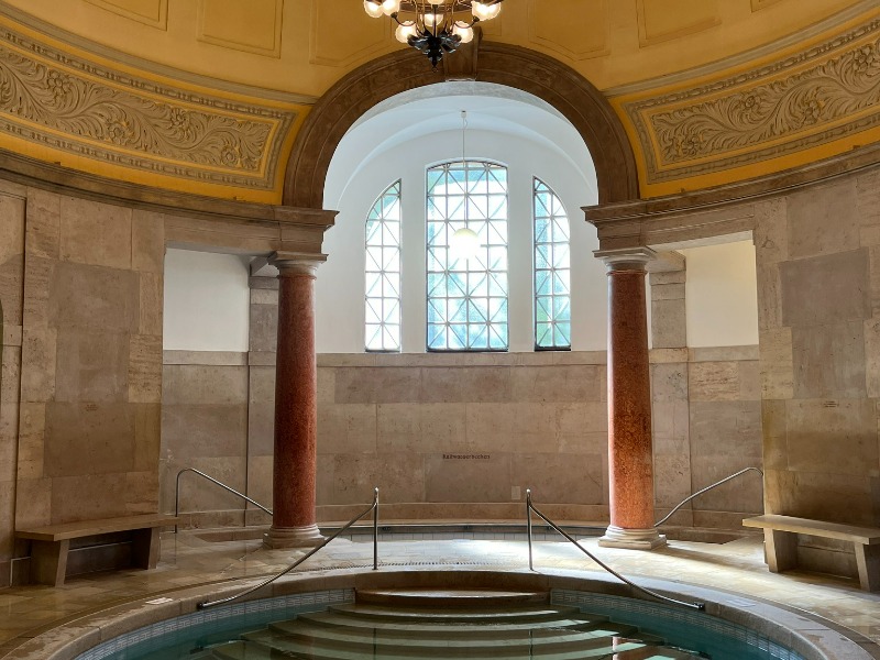さて、ミュンヘンのサウナですが、基本的に男女共用です。そして、なんと水着着用は不可。つまり素っ裸の男女が同じサウナに入ります。そもそも更衣室から男女共用。しかし、最初は1階のサウナまで素っ裸で行くのも恥ずかしいので、腰にタオルを巻いて移動しました。1階は着替え用の個室や休憩スペースがありますが、さっそくサウナのエリアへ。まず目を引くのが、サウナの奥に現われたローマ式浴場。偶然にも誰もいなかったので、こっそり写真を撮りました。円形のお風呂は30度ぐらいで、日本人にはぬるく、温水プールのような感覚。奥に長方形の水風呂があり、サウナ後はこちらで身体を冷やします。