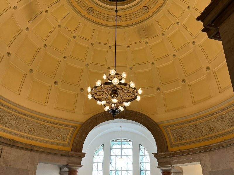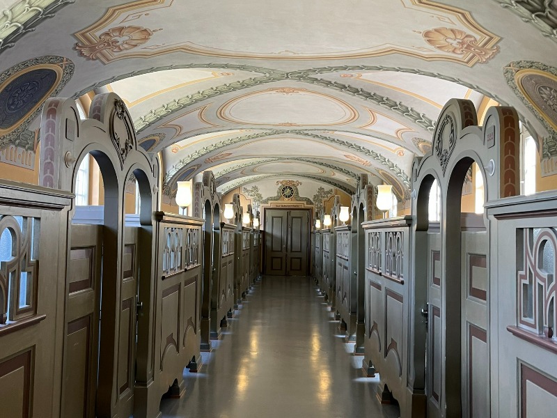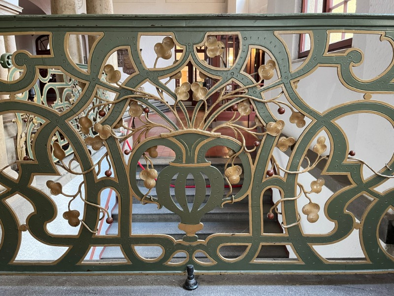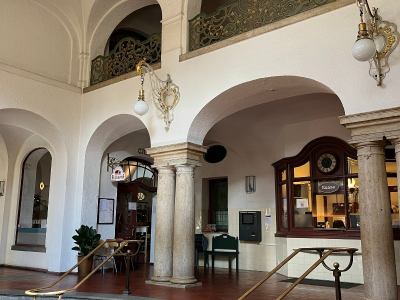 市内を南北に流れるイーザル川を渡っていると見えてくる施設は、驚くほど豪華なアール・ヌーヴォー様式の建築。1901年の開業で、黄色い建物の上に建つ白い時計台が凛々しい。建物の南側にある入口は、重厚さと愛らしさを兼ね備えた外観。ずっしりと重い木の扉を開けて中に入ると、エントランスも豪壮な造りで、吹き抜けの窓から燦燦と太陽が降り注いでいます。