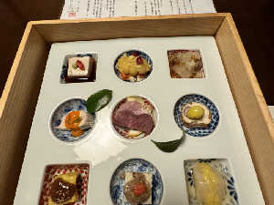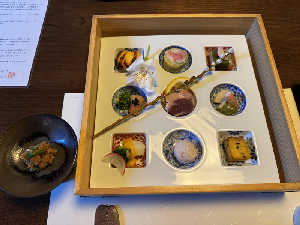 こちらは八寸。 エノハのお造り、塩焼、直入のフレッシュサラダ、豊後牛ステーキ等々 どれも素晴らし!