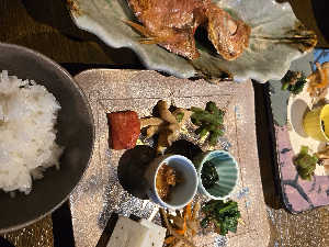 朝からひとつひとつ丁寧に作られた贅沢な朝ごはん。 わたしは金目鯛を、夫はカレイを