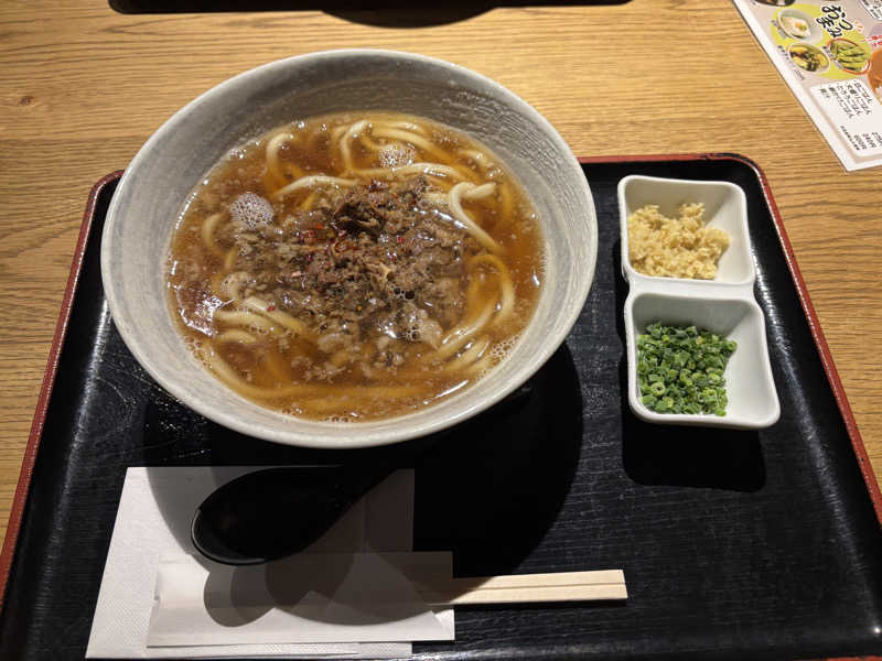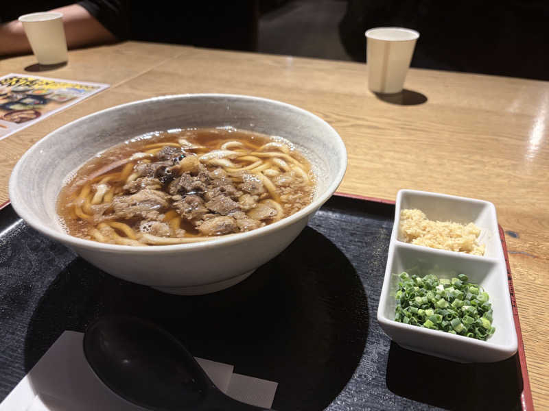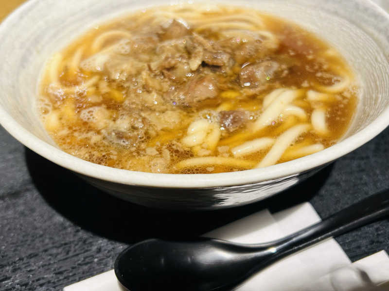 朝うどん🥢ゴロゴロの肉がうまい🍖生姜多くてスープ入れて飲むと体が温まりましたぁ☺️