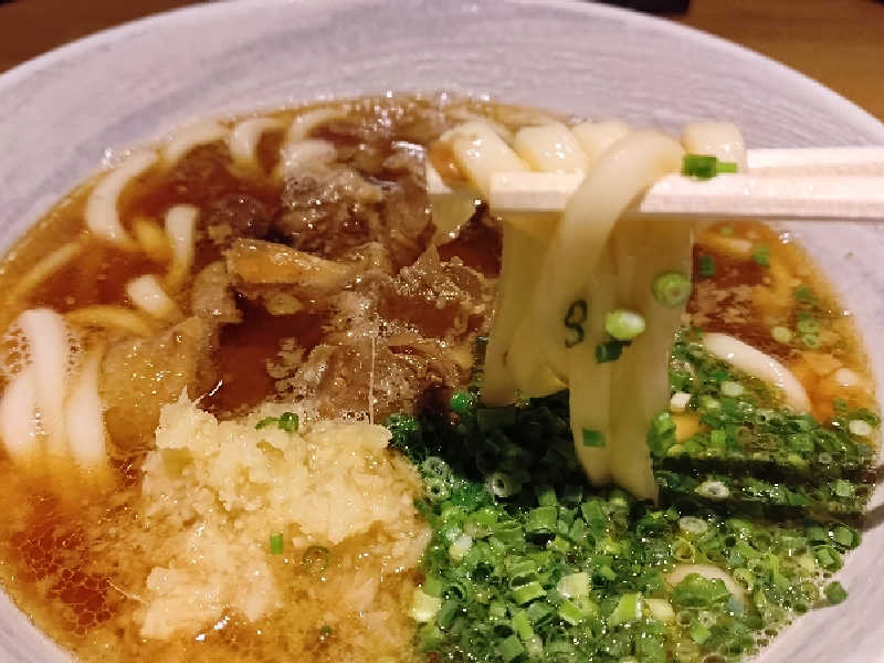 牛すじのうどんなんだけど、麺が想像の3倍もちもちだった😆大量の生姜と葱にもビックリ😮旨いうどんだ🥰