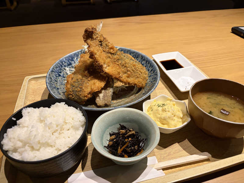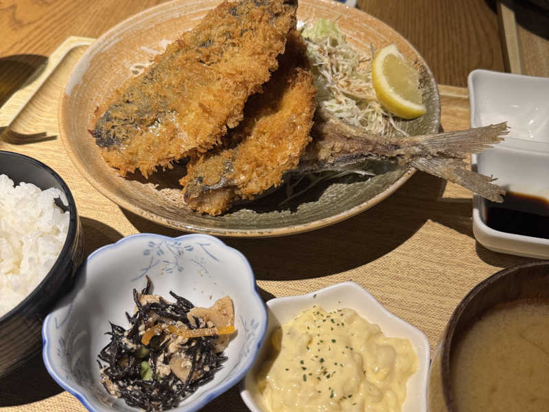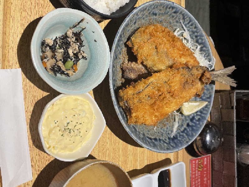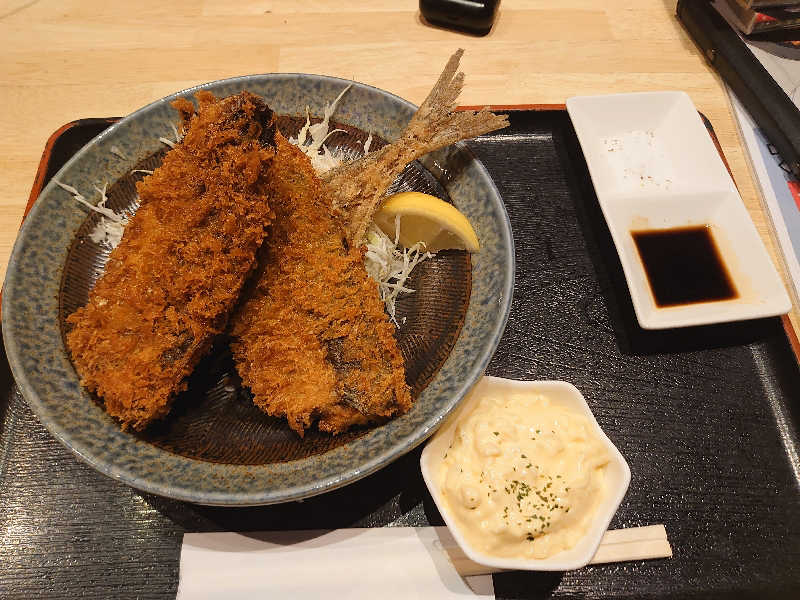 念願の湯らっくすのアジフライ✨️デカくて衣サクサクで中の身ふわふわ、味変3つもでき、美味しすぎたっ!!