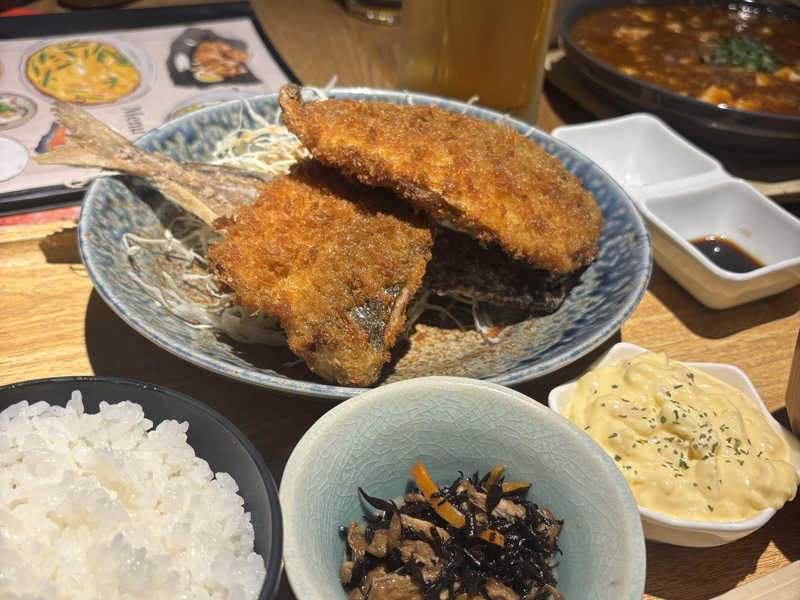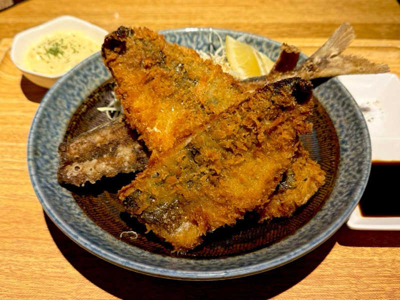 どデカいアジのフライ。3枚に下ろした後にそれぞれ揚げてる。骨の部分がカリカリで塩付けて食べたら最高!