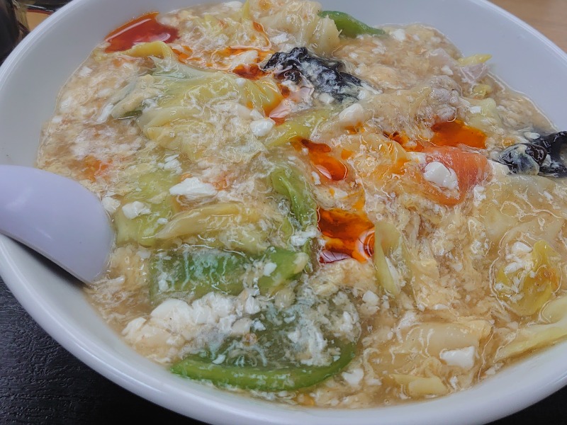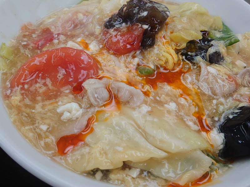 熱々野菜の下にもたっとした麺が沈んでおり、どうやって食べよう?お酢でほぐす?からの気付くとからっぽ。