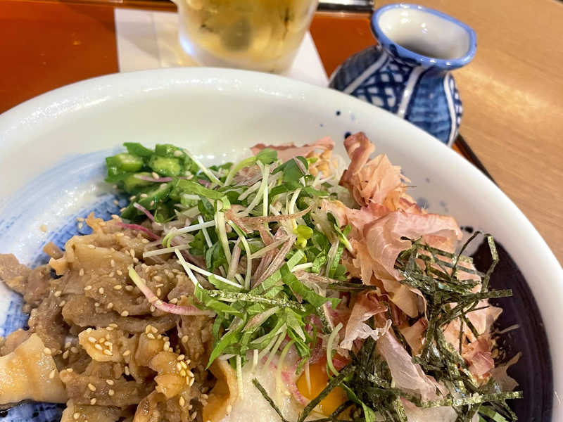 とろろオクラ納豆、カイワレ茗荷シソの爽やかさ。甘辛豚肉の旨さに海苔と鰹節の香り。盛り沢山な贅沢蕎麦!