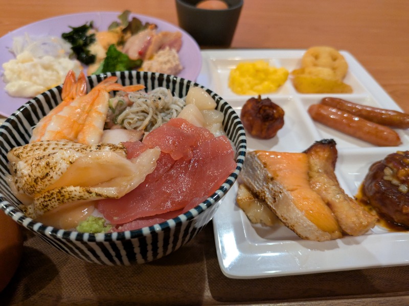 海鮮丼⇨イカまぐろ納豆とおにぎり お膳を二周してしまった。