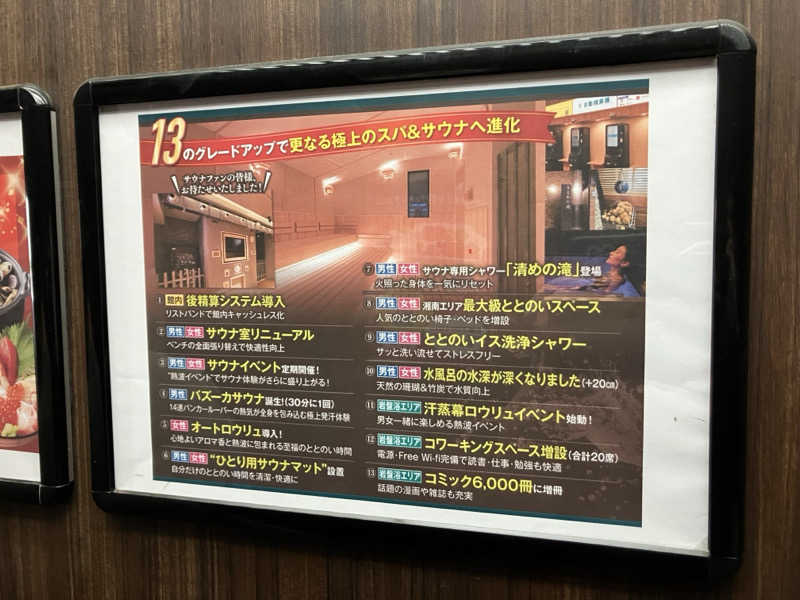 キャッシュレス化、ロッカー100円不要化、サ室と水風呂進化、滝シャワー追加