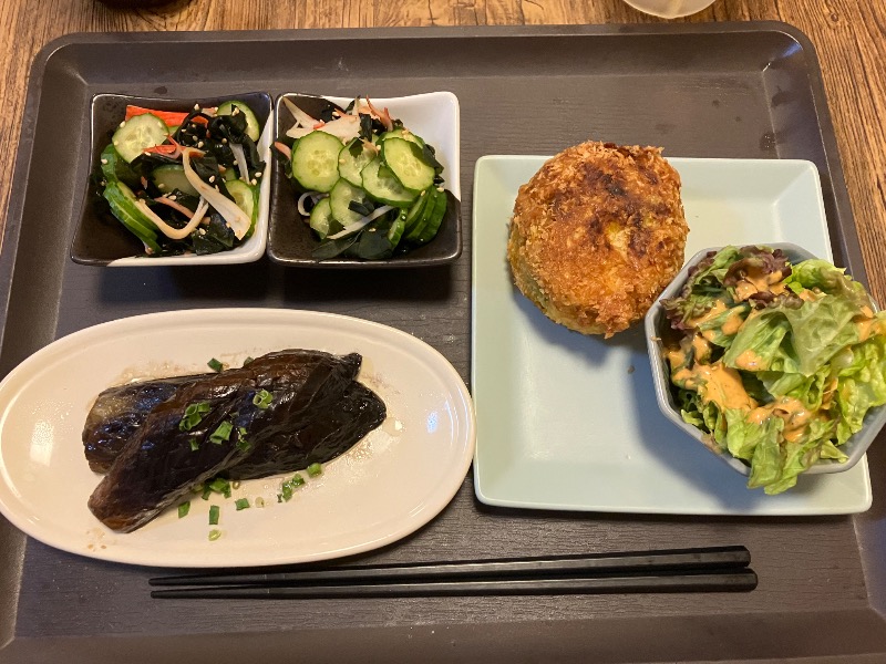 女湯に向かう途中食堂に人の気配があったので見ると平日にも関わらずテーブルに沢山のおかずが並んでいました。