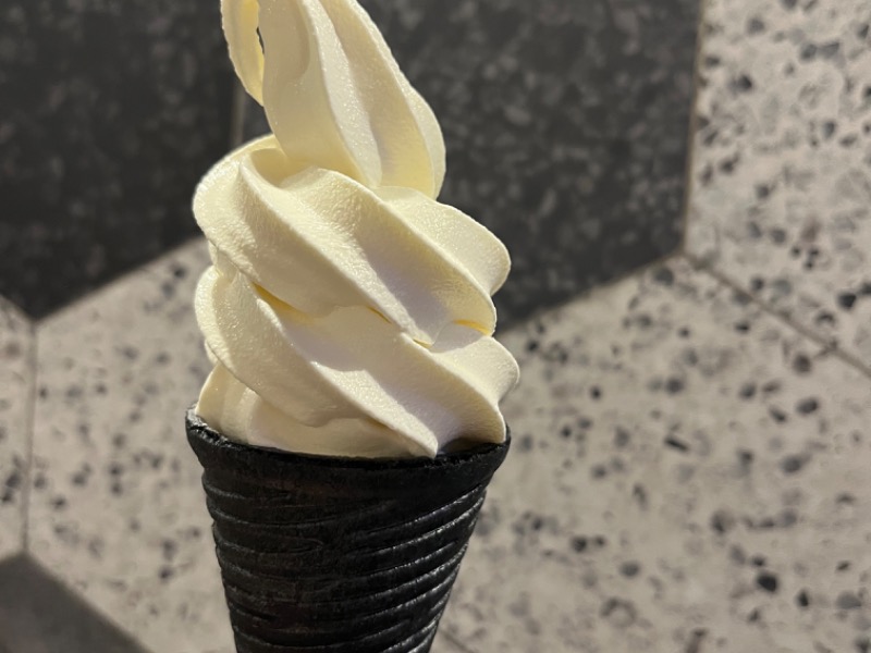 見た目もシュッとした竹炭のコーンは、甘さ控えめなだけじゃなく整腸作用まで期待できるらしい🍦