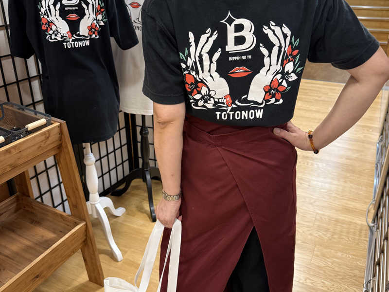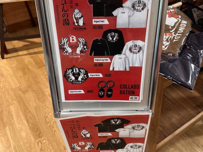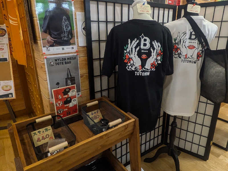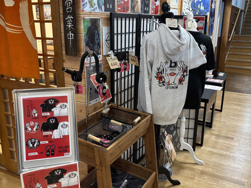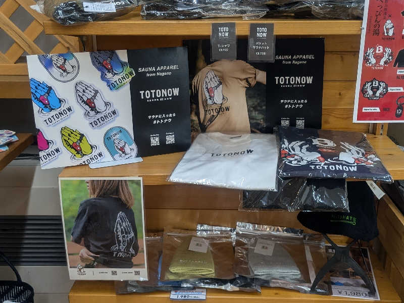 番台前の売店では、サウナ関連のグッズやドリンクが豊富に販売♫ 女将さん自ら《totonow》コラボTシャツをユニフォームとして着用されてました✨️