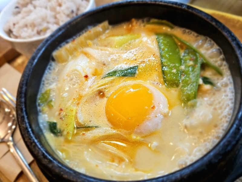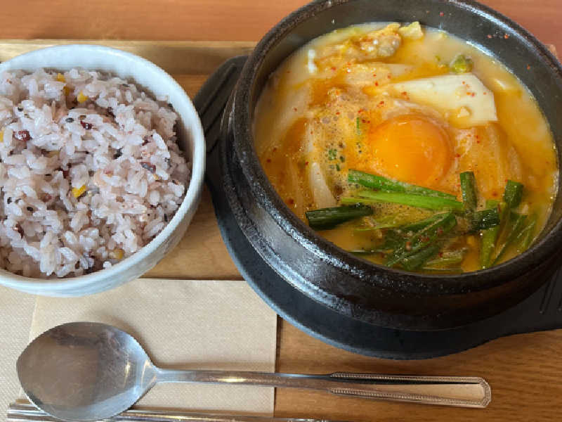 海鮮の旨味半端ない自家製スンドゥブスープと、豆乳のコクが相性抜群。おかわり無料の15穀米が進む進む。