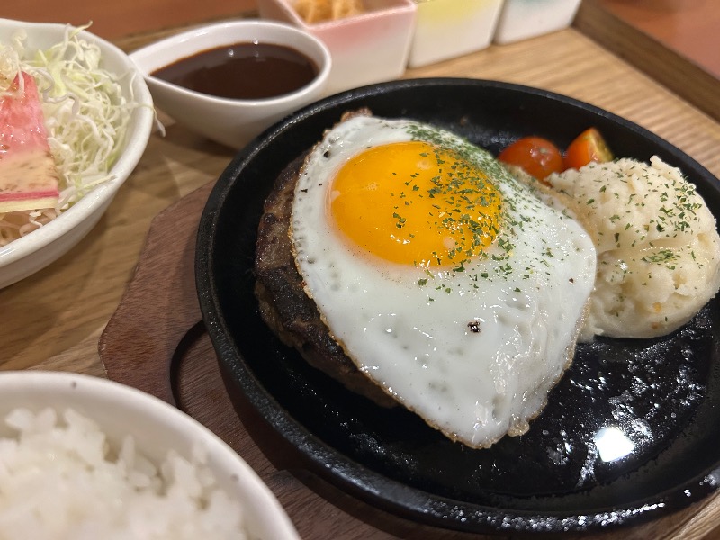 牛100%の旨みを閉じ込めたデミグラスハンバーグにとろり目玉焼き🍳味噌汁と一緒に箸で味わう幸せ☺️