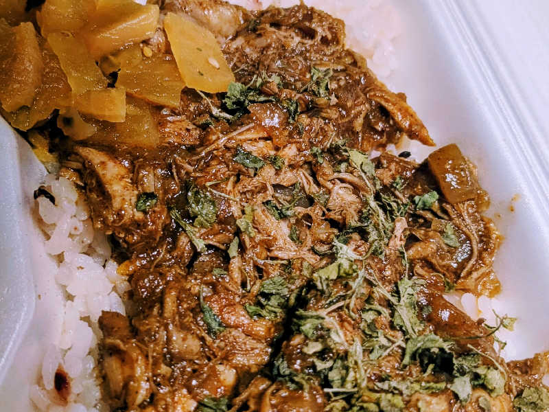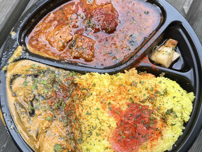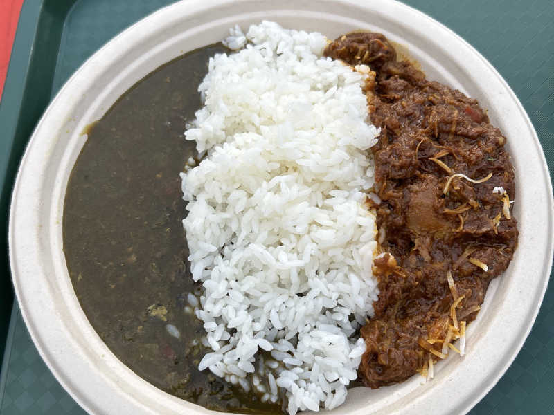 サ前飯。ポークビンダルーと南幌産キクラゲの濃厚バターチキンの2種。