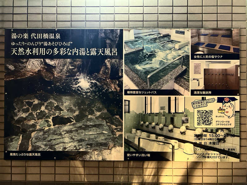 甲州街道沿い。人車が行き交う賑やかな場所で今日も明るく元気に営業を続ける『湯の楽代田橋』さんに久方ぶりに足を運んだ。訪問日は奇数日であったので、男性はソルティサウナ側。前回はドライサウナだったが思考を変えて。