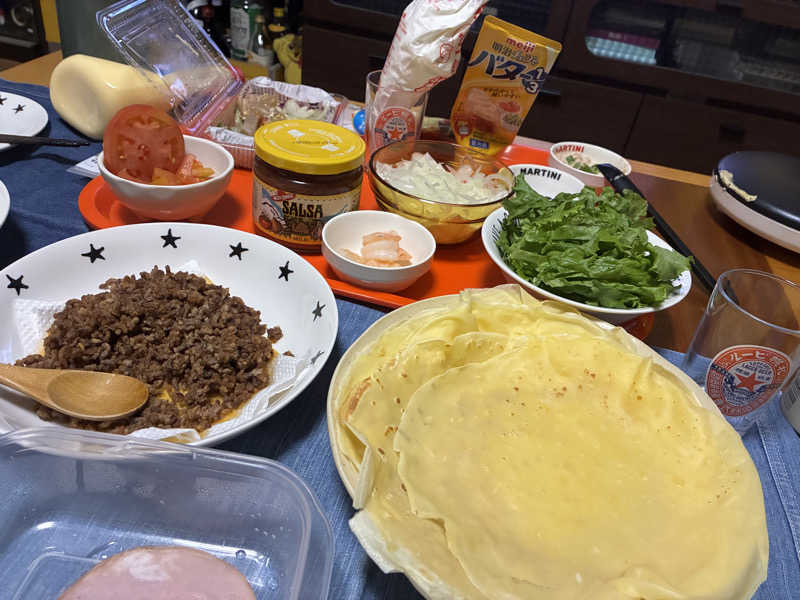 タコスの中身をクレープで巻いてみたい私の我儘パーティー🍻トルティーヤもあったが私は断然クレープ派