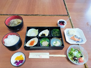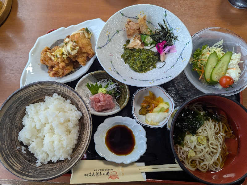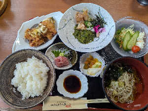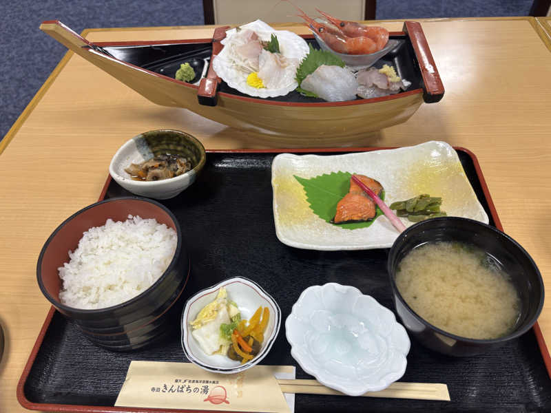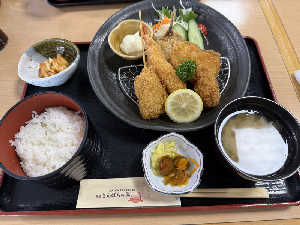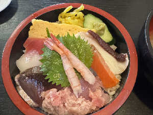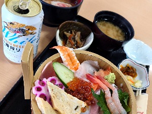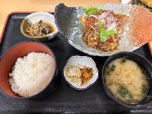 やはり寺泊では海鮮ものを!刺身が厚切りで食べ応え充分!味噌汁もアサリとあおさ入り。