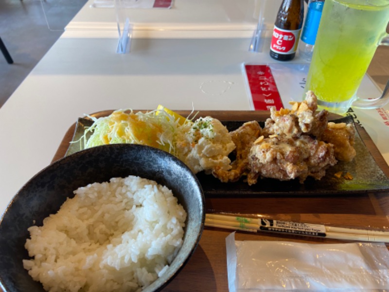 揚げたてで唐揚げと言うよりも竜田揚げに近い感じ キャベツもセットで付いてくるのも良い