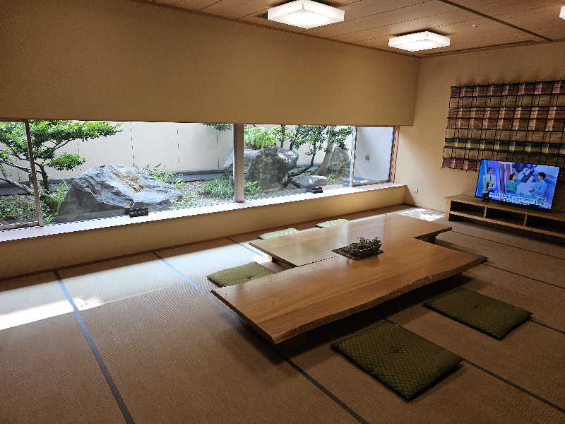 小庭が見える休憩室には大きなテーブルと座布団があって、そこに自販機と生ビールサーバーもあり、ゆったりくつろげる🍺