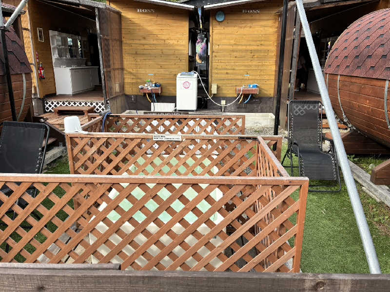 男性用と女性用のバレルサウナの間にビニールプールと外気浴に利用できるイスが6脚設置されている。